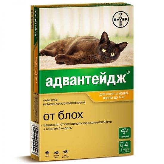 Выпускается препарат Адвантейдж в виде жидкости желтого цвета. Фасуют в тюбики-пипетки с указанием дозировки уже готовые к применению. В одной упаковке содержится 4 тюбика-пипетки, в каждом 0,4 мл средства. В связи с высокой стоимостью препарат продают поштучно. Срок хранения капель с даты изготовления 5 лет. Отдельно выпускают средство для котят и кошек весом меньше 4 кг. Препарат отличается меньшей концентрацией активного вещества. На упаковке Advantage имеется соответствующее указание. Капли для кошек весом более 4 кг можно применять для уничтожения блох на собаках.