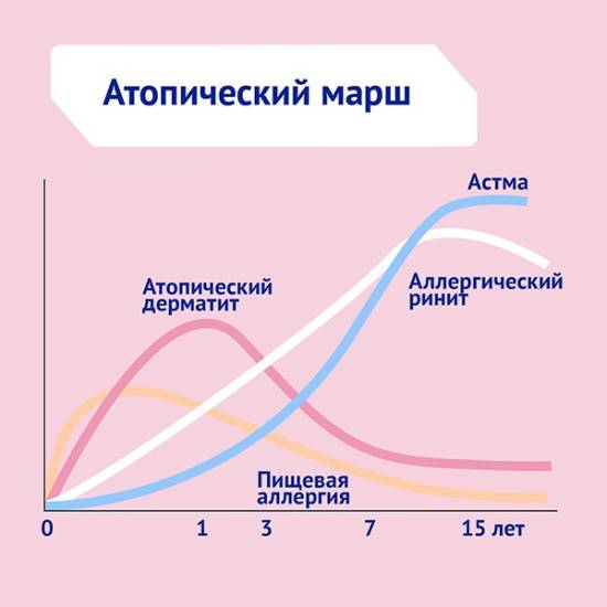 Атопический марш – это возрастная этапность перехода одного проявления в другое с увеличением числа аллергенов. Аллергические реакции на пищу в раннем детстве могут перерастать в атопический дерматит, аллергический ринит или бронхиальную астму в более старшем возрасте.
