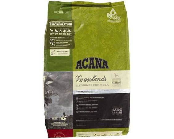 - выпускаемый по технологии без использования зерен. ACANA Grasslands может использоваться для кормления собак разных пород. В его необычном составе производители объединили рыбу с мясом утки и ягненка. Также в состав включены морские водоросли, лекарственные травы и ягоды. Такое питание может использоваться у собак с чувствительным пищеварением в силу полного отсутствия аллергенов.