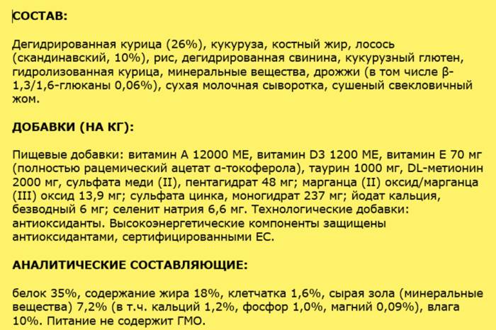 По содержанию компонентов питания – жира, белков, клетчатки, витаминов – корм соответствует задекларированному суперпремиум-классу. Однако состав компонентов позволяет в этом усомниться.