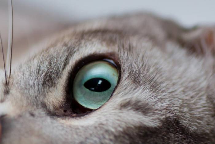 - Глаза крупные и широко посаженные, формы полумесяца, незначительно раскосые. Глаза зеленые, однако их цвет периодически меняется на янтарный, желтый, ненасыщенный коричневый цвет.Волоски на веках черные, на надбровьях — цвета основного окраса;