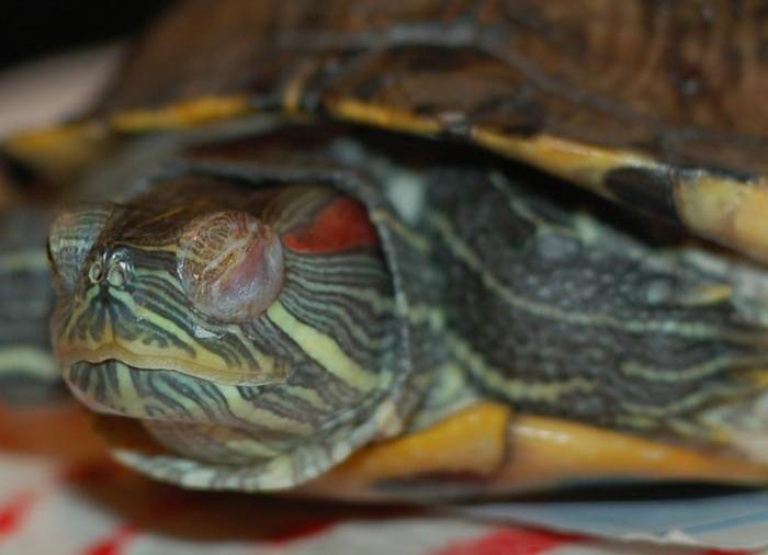 Вероятно это:Абсцесс в ухе. В случае с красноухой черепахой, наиболее частая причина — грязная вода.