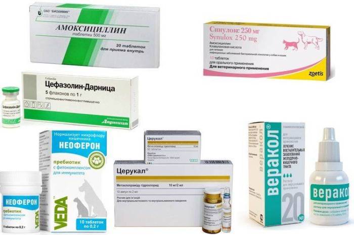 При сильном обезвоживании животному вводятся изотонические растворы, а в особо тяжелых случаях может понадобиться переливание крови. При рвоте применяют противорвотные препараты (Церукал или Веракол), а чтобы уберечь кошку от различных инфекций, вызванных размножением бактерий, потребуется использование антибактериальных препаратов (Кламоксил, Амоксицилин).