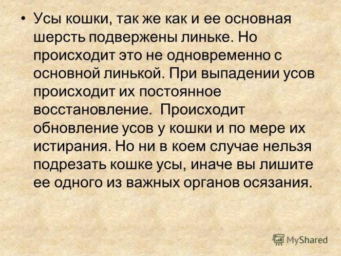 Усы кошки, так же как и ее основная шерсть подвержены линьке. Но происходит это не одновременно с основной линькой. При выпадении усов происходит их постоянное восстановление. Происходит обновление усов у кошки и по мере их истирания. Но ни в коем случае нельзя подрезать кошке усы, иначе вы лишите ее одного из важных органов осязания.