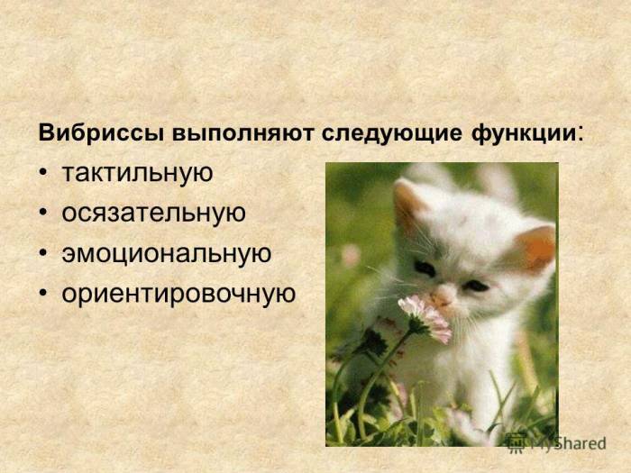 Ориентация в окружающем пространстве. Получая отражающие импульсы от предметов и стен, кошки отлично ориентируются даже в незнакомой обстановке. Анализируя изменения воздушного потока, животное получает информацию о преграде на ее пути.