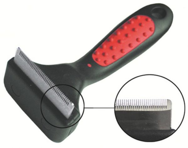 Расческа для кошек (фурминатор) похожа на бритву, но инструмент предназначен для тщательного и аккуратного вычесывания непригодной шерсти. Существуют различные размеры фурминаторов для разных животных, но в целом конструкция состоит из ручки и лезвия-гребня