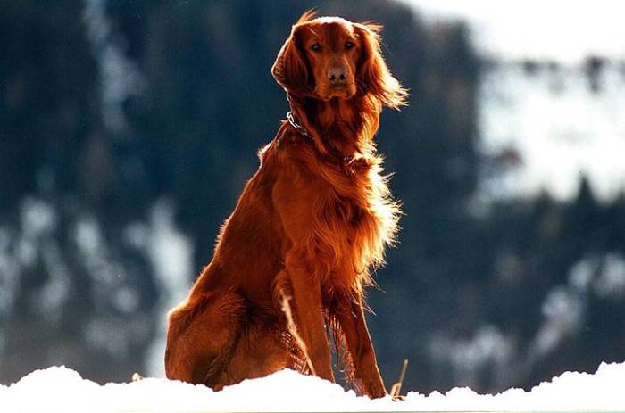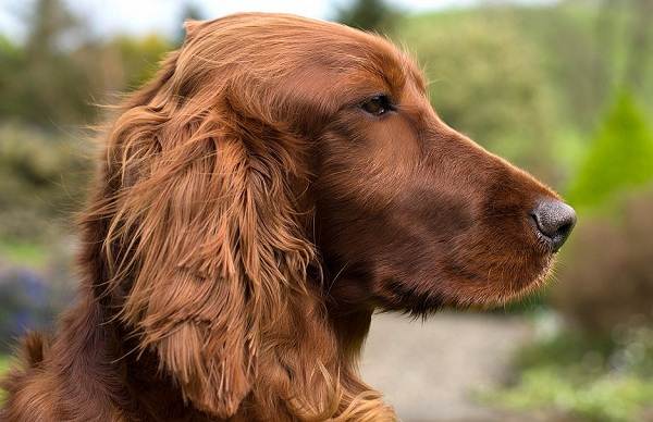 Ирландский сеттер на фото выглядит очень презентабельно. По этой причине его регулярно снимают для рекламы кормов и семейных мероприятий. Животное отличается очень яркой внешностью. Его шерсть – длинная, слегка кучерявая. Её оттенок – насыщенный красный. Реже рождаются более тусклые по цвету шерсти псы этой породы с каштановым отливом.