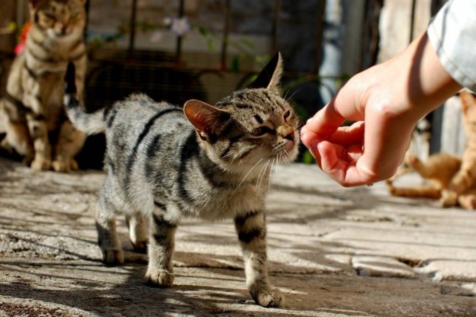 Мама-кошка учит своих котят, что человек для них не представляет опасности, а наоборот, способен заботиться о них, кормить их