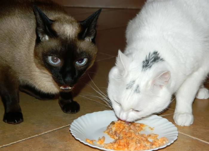 В период, когда у кота и кошки раздельное питание, миска питомца, длительное время находящегося в доме, должна обязательно находиться на своём месте, а иначе животное может начать нервничать, перестать принимать пищу или проявлять агрессию по отношению к новому домочадцу.