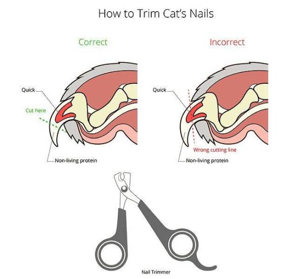Если между пальцами отросла шерсть, ее удаляют специальной машинкой. Отрезать ногтевую пластину можно лишь на 1-2 мм. Внутри когтя располагаются мягкие ткани, состоящие из нервных окончаний и кровеносных сосудов. Вместе они образуют пульпу, при повреждении которой может открыться кровотечение, а животное будет испытывать острую боль. После неудачной манипуляции кошка может хромать в течение нескольких дней. Если инструменты при этом были недостаточно обработаны, в мягкие ткани может проникнуть инфекция, что опасно для здоровья питомца.