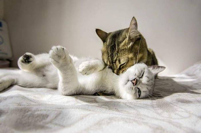 Поощряйте любое позитивное взаимодействие вашей старшей кошки с котенком, используя похвалу, угощение и ласку. Нужно делать так, чтобы ваша кошка ассоциировала котёнка со счастливыми, позитивными вещами.