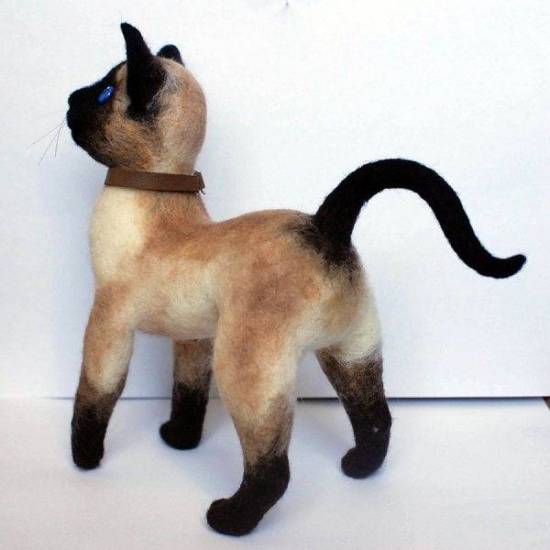 Котика более сложного можно делать по фотографии настоящего животного. Аналогично валяем отдельные детали по заготовленным лекалам и крепим их к тельцу.