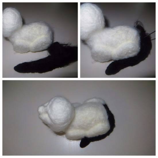 Делаем хвост. Для этого берем черную шерсть, формирует из нее валик и приваливаем его к задней части кошки.