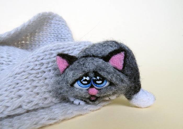 – кошечки почти закончено. Остается тонкой иглой «пригладить шерстку» – подравнять, поправить, если что-то не так лежит, топорщится. Проколы выполняйте поверхностные, слегка протыкая шерсть. Для украшения сделайте цветочек или сердечко. На шерстяную нитку прикрепите сердце к шее кошки. Очаровательное создание будет радовать своим видом.