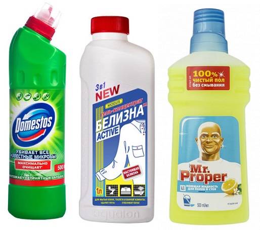 - профессиональные для мытья полов – Мистер Мускул или Пропер, Доместос, Белизна;