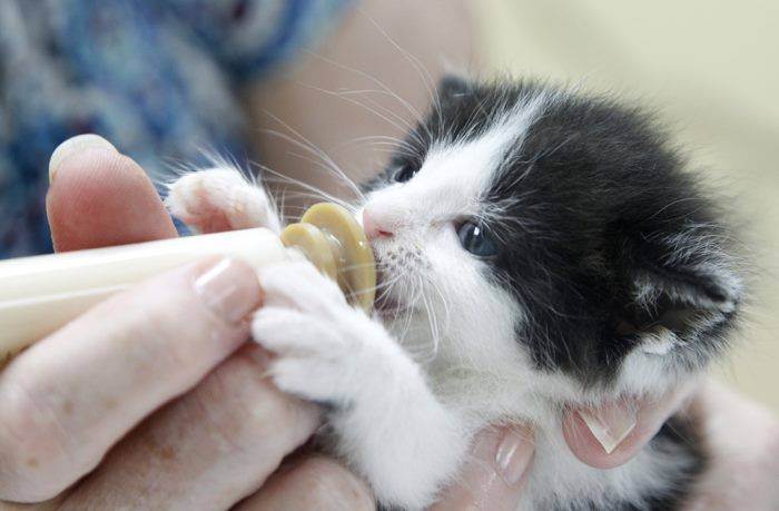 Котенка кормят, держа его вертикально, если он совсем мал, или лежа на животе. Категорически нельзя укладывать котенка на спину. Котята должны сами сосать бутылочку или носик шприца, заливать в них смесь недопустимо – она может попасть в дыхательные пути.