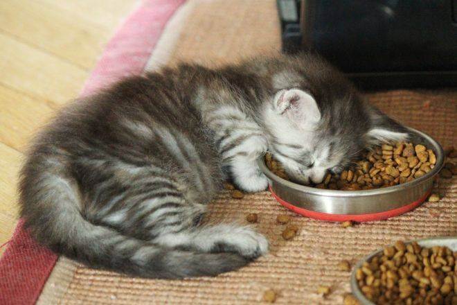 До года мейновские котята растут и развиваются очень быстро, им полагается пища в больших объемах и калорийности. Для нормального развития им рекомендуется давать еды примерно в таких объемах: