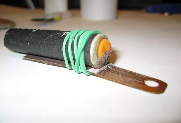 - Вклеиваем на стенку внутрь трубы серные полоски от коробка спичек.