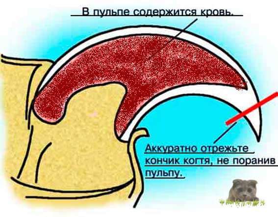 Очень важно отрезать только кончик когтя, не повредив пульпу. Необходимо рассмотреть коготь на просвет, чтобы разграничить розовую часть (пульпу, содержащую кровеносные сосуды) и белесую полупрозрачную часть