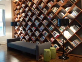 Форма полки может быть разной. В интерьере часто можно встретить невидимые модели. Такой эффект удается достичь благодаря тому, что все пространство оказывается заполненным книгами. Интересно смотрятся зигзагообразные варианты, модели в форме лестницы и вариант с нагромождением полок.