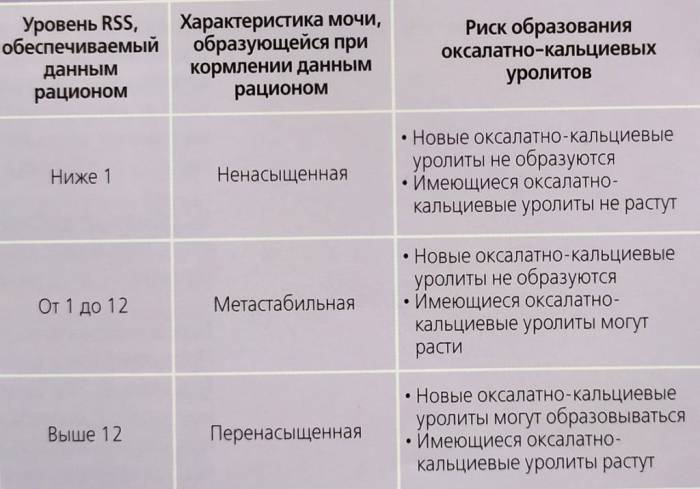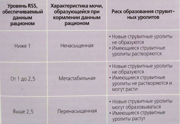 Если животное уже болеет, была острая форма и оперативное вмешательство, необходима определенная диета. Состав диеты зависит от того, какой химической природы камни и песок в моче животного. Есть два типа конкремента: струвиты, содержащие фосфаты, и оксалаты (в составе щавелевая кислота). Предварительно делается анализ мочи животного и согласно ему, назначается диета.