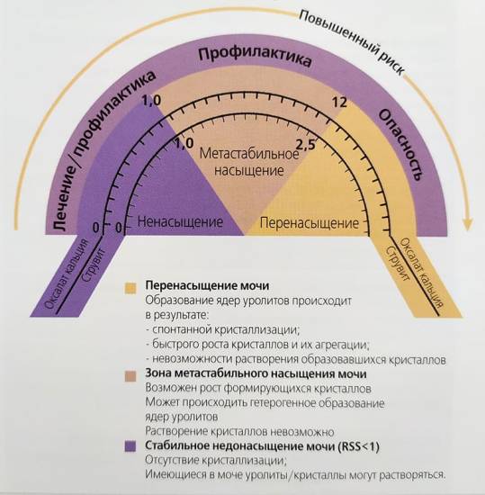 Для оценки риска образования уролитов в мочевой системе пациента каждое из них имеет особое значение. Выше RSS мочи ‒ выше риск образования кристаллов, а при низком RSS опасность образования уролитов становится менее значимой.