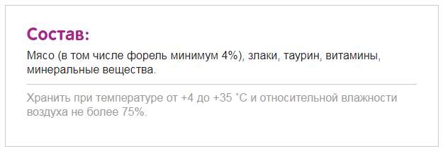 | Аппетитный микс (85 гр. 28 руб.) | Креветки и лосось в сливочном соусе | Мясо и субпродукты, злаки, растительное масло, таурин, витамины, минеральные вещества/ | Рыба и морепродукты (лосось и креветки, % не указан). Молокосодержащий продукт. | |