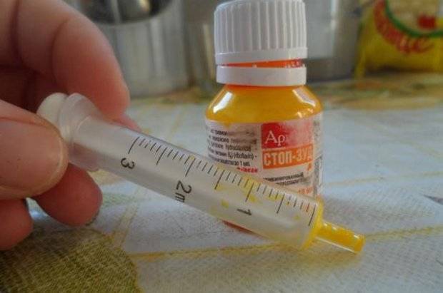 - ‘Стоп зуд: суспензия’. В виде суспензии препарат реализуется во флаконах объёмом по 10 и 15 мл. Ёмкость с содержимым помещается в картонный короб, в комплект входит инструкция по применению и шприц-дозатор. В состав суспензии входят следующие активные и вспомогательные вещества: левомицетин – 5 мг, триамциналон – 0,5 мг, гидрохлорид лидокаина, экстракт календулы и прочее.