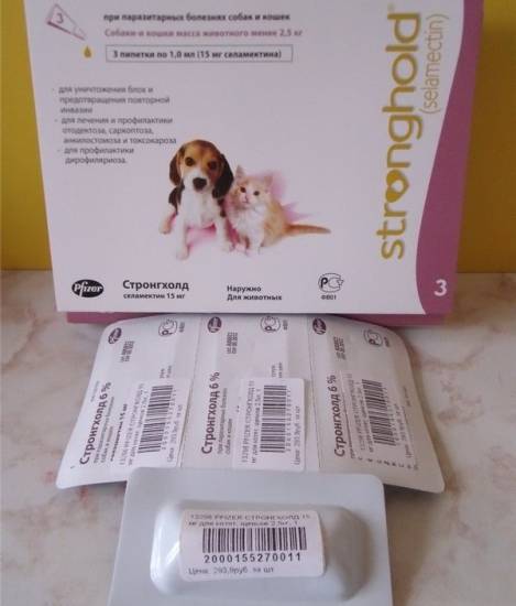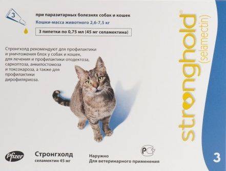 | Стронгхолд | селамектин | токсокароз, наличие блох, власоедов, вшей, анкилостомоз, отодектоз, дирофиляриоз, блошиный дерматит, саркоптоз | мыть кошку можно через 2 часа, пипетки с крышкой | раствор (капли) в пипетках по 0,25, 0,5, 0,75 мл и 1, 2 мл | от 450 рублей за 1 пипетку |