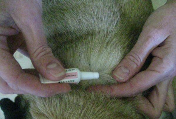 Препарат аккуратно наносится животному из флакона в область холки после раздвигания шерсти.