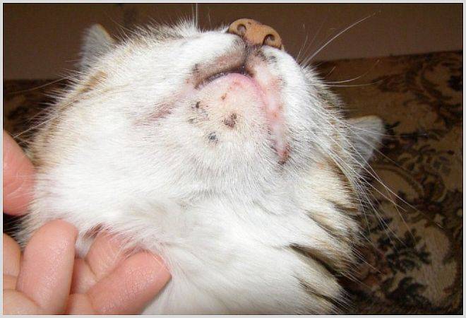 В большинстве случаев акне у кошки располагается на подбородке и в запущенной форме вызывает сильную отечность.