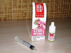 - Стоп-Интим — препарат останавливает возбуждение, блокирует поведенческие признаки течки, и соответственно предотвращает от нежелательной беременности. Продается во флаконах с капельницей.