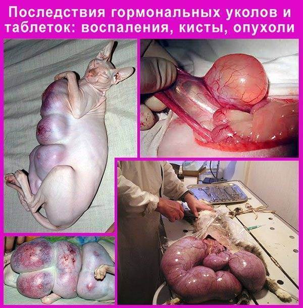 Ветеринарным врачам зачастую во время операций на матке у кошек, которым давали гормональные препараты, приходится видеть перетяжки (так называемые кольца), образовавшиеся из соединительной ткани. И оперативное лечение вызванных гормонами заболеваний не всегда может вернуть животное к полноценной жизни. Очень часто хозяева обращаются в клинику на последних стадиях заболевания, когда спасти животное уже просто невозможно.