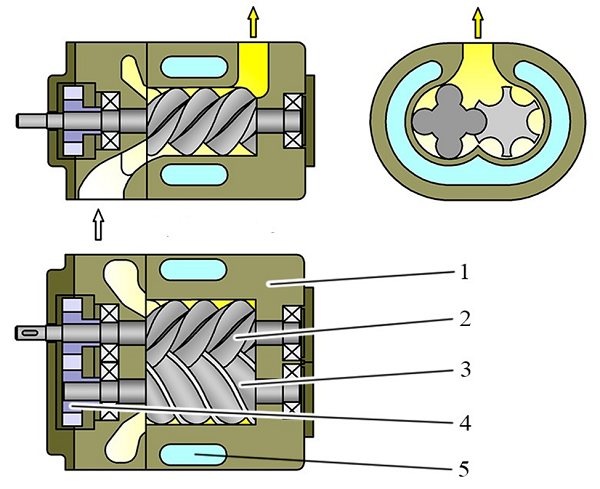 Основным узлом этого устройства является винтовой блок (см. рис. ниже). Он состоит из корпуса (1) и расположенной в нем винтовой пары (2 и 3) – ведущего и ведомого ротора.