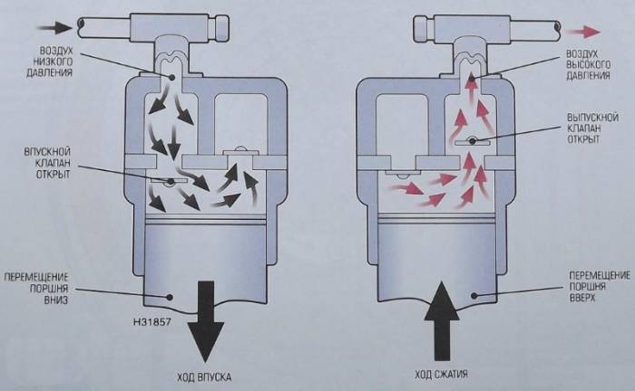 После начала вращения роторной пары через впускное отверстие и регулятор всасывания начинает поступать воздух, который заполняет винтовые впадины по всей длине. Дальнейшее проворачивание винтов уменьшает объем рабочей камеры и увеличивает давление в ней. Когда впадины винта соединяются с выпускным отверстием компрессора, сжатая среда через радиатор охлаждения выходит через выпускное окно агрегата.