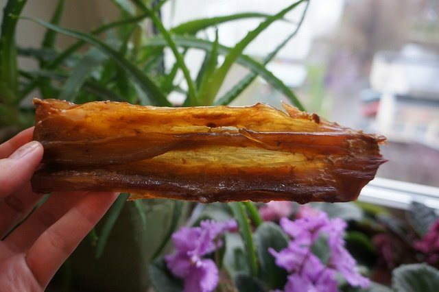 Далее кусок жилки разрезают вдоль и в таком виде отправляют в духовку, устанавливая режим 70°С+ вентиляция (функция заменяется приоткрытой дверцей духовки), Сушат 2-3 часа, затем выключают нагрев и оставляют да полного остывания духовки, также с вентиляцией.